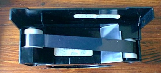 At first glance, it would appear to be impossible for a tape with two spools mounted on top of one another to ever work. How does the tape get from the bottom spool to the top? If we look at the next picture, it makes it slightly easier to understand, but one might still imagine that it would damage the tape if it were ever to try and move. Well, yes it would if you tried to turn one of the spools with the tape in this state.